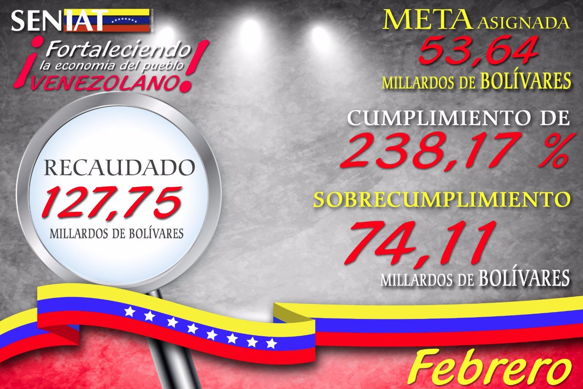 El SENIAT cumplió en un 238,17% la meta de recaudación del mes de febrero establecida en 53,64 millardos de Bs.